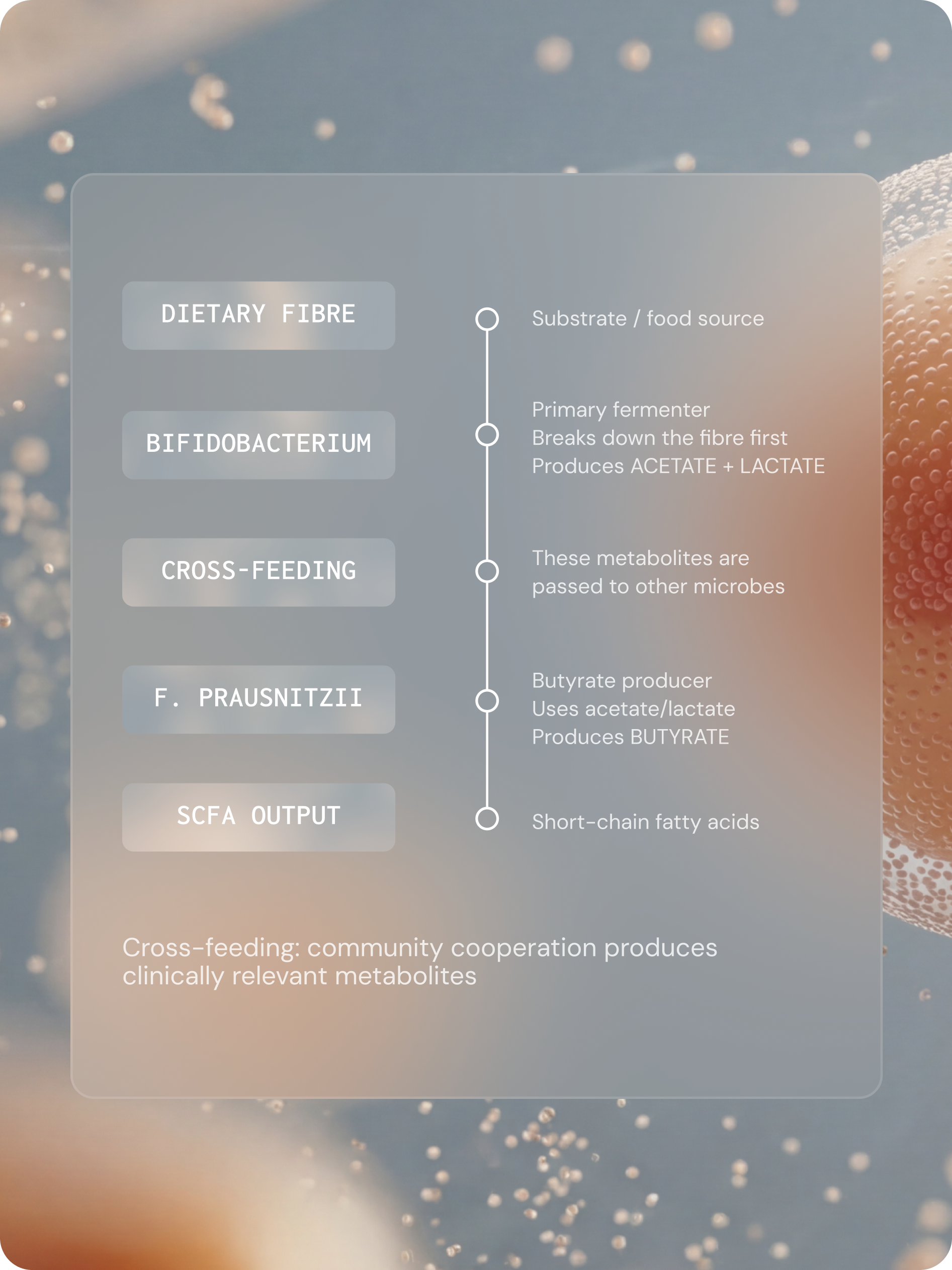 What microbes do is strongly influenced by what they are fed. Many dietary fibres cannot be digested by human enzymes but can be fermented by gut microbes, producing short-chain fatty acids such as acetate, propionate and butyrate — metabolites that support barrier integrity, reduce inflammation and regulate metabolism.11,12