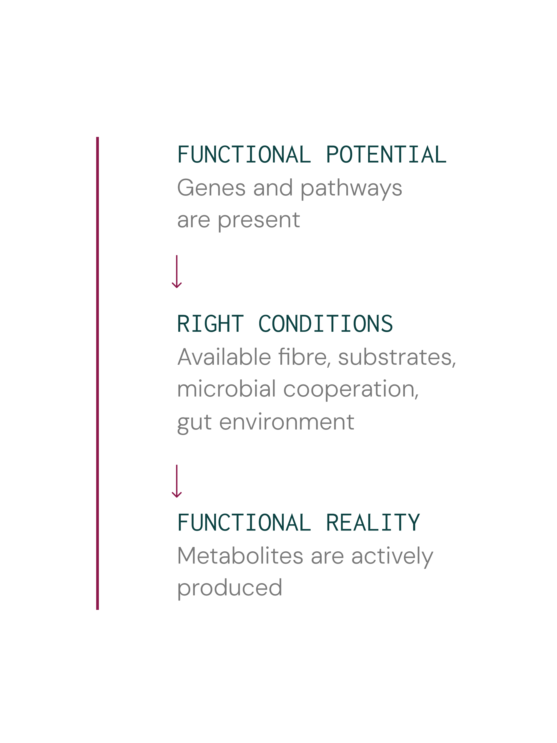 Functional potential only becomes functional reality when the right fuels and conditions align. A functional, ecosystem-based lens supports more personalised, targeted strategies to maintain or restore health.3,4